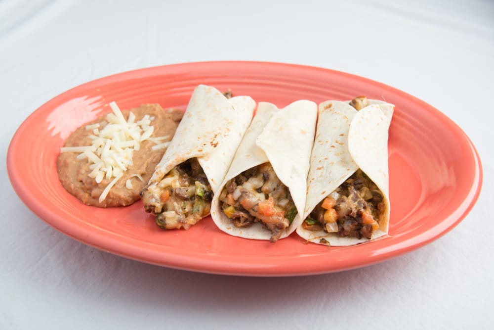 2 pieces. 2 soft corn tortillas stuffed with your choice of fillings, covered with our red enchilada sauce.