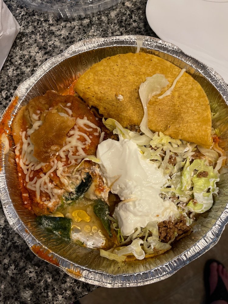 Thinly sliced steak, 1 enchilada, 1 chile relleno served with rice and beans. With Guacamole plus extra charge. New